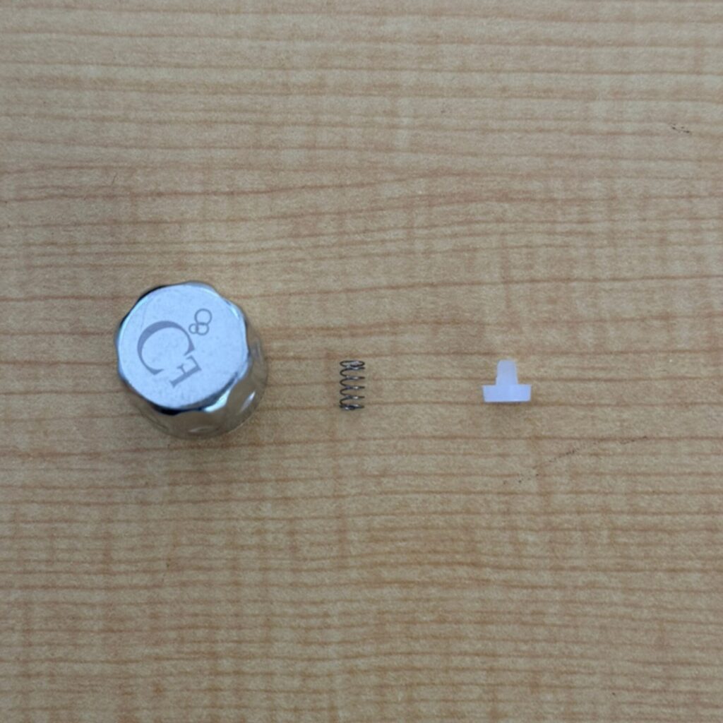 もし、過去にキツく締めすぎてしまっていた場合、取り外した時に**「バネとシリコンを支えるパーツと、バルブ(キャップ)」がガッチリくっついて、一体化してしまう**ことがあります。